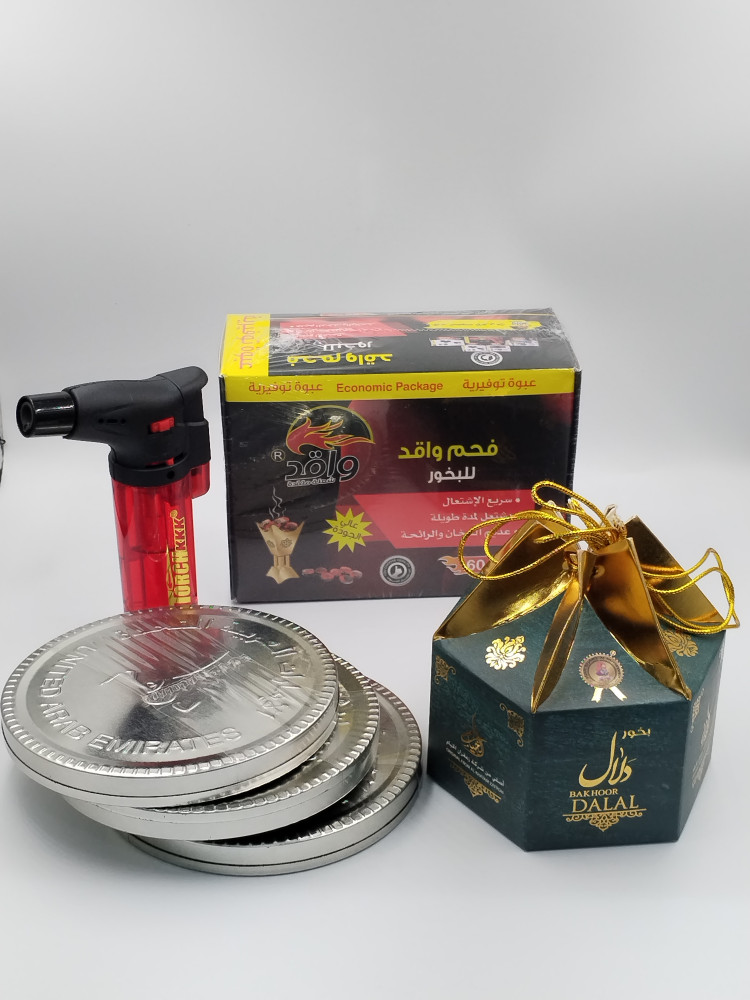 A set of 3 Dirham incense with Dalal incense, a 60-piece charcoal box and a Torch lighter